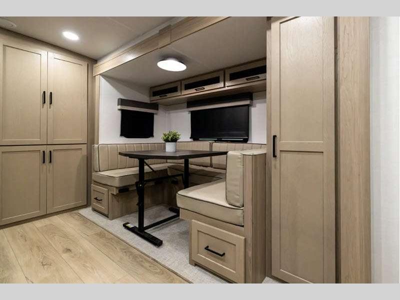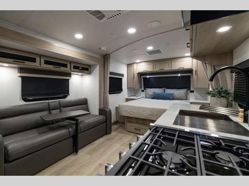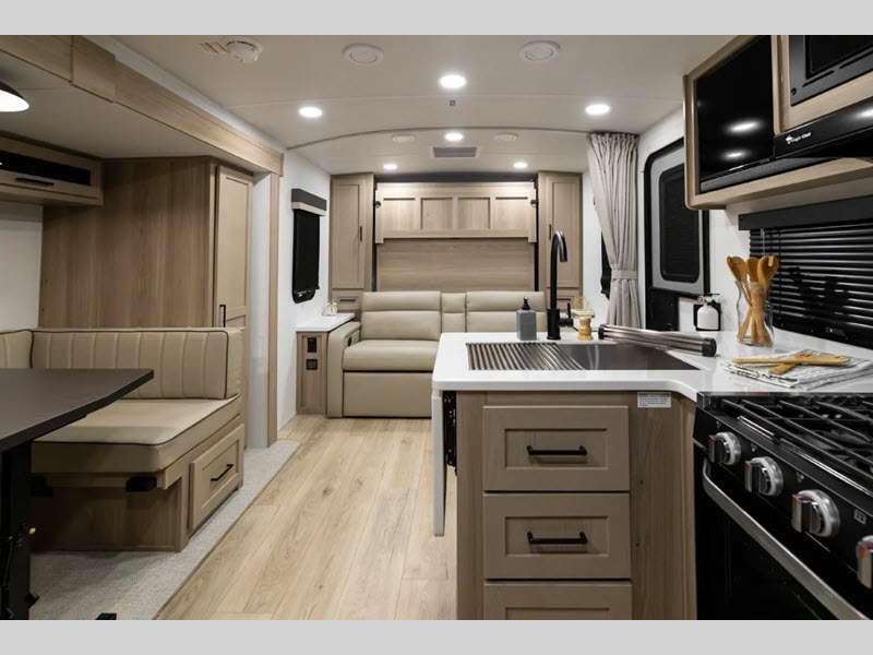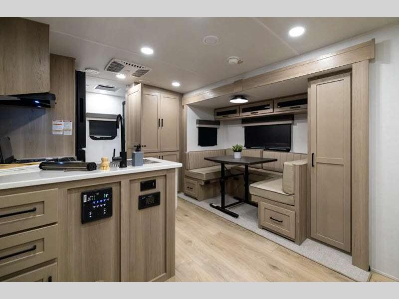 Each model is constructed with a fully laminated walkable roof, 6-sided full-aluminum frame, and a fiberglass front cap with Clear Coat for added protection. You will appreciate the slam baggage doors and 200W solar panel outside, plus there is a Climate Protection Package for better insulation. Inside, you'll love the solid surface countertops, roller shades, and soft close roller bearing drawers.