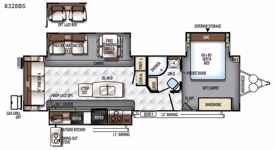 Along the rear wall you will find a 76" hide-a-bed sofa with overhead cabinets, and two end tables. Adjacent enjoy standard theater seating for two with storage above in a slide out along with a free standing table including four chairs. You can also choose Lazy Boy brand recliners if you like. Don't forget to enjoy the entertainment center on the end of the kitchen slide out along the curb side wall. There is even a fireplace option available.
